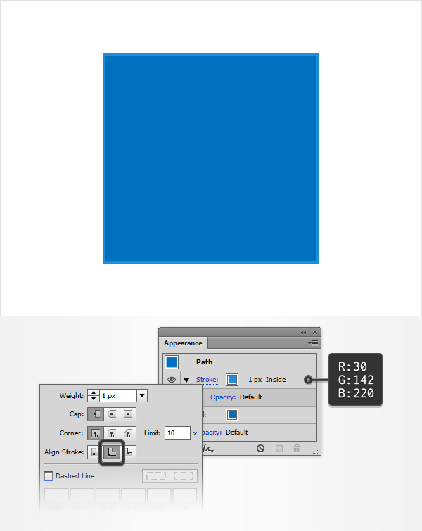 Make sure that your blue rectangle stays selected and focus on the Appearance panel (Window > Appearance). Select the stroke, add your “colorOne” color then simply click on that “Stroke” piece of text to open the Stroke fly-out panel. Make sure that the Weight is set at 1px then check the Align Stroke to Inside button.