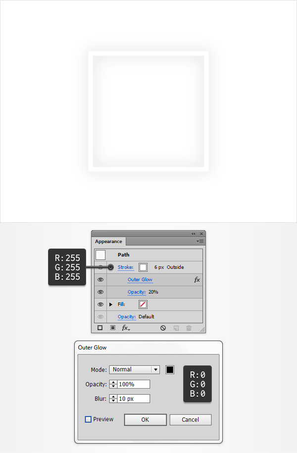 Using the Rectangle Tool (M), create a simple square and make sure that it stays selected. Focus on the Appearance panel, remove the color from the fill and select the stroke. Set the color at white (R=255 G=255 B=255) and the Weight at 6px, check the Align Stroke to Outside and lower its Opacity to 20% then go to Effect > Stylize > Outer Glow. Enter the properties shown in the following image and click OK.