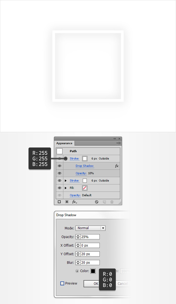 Make sure that your square is still selected, focus on the Appearance panel and add a second stroke using that same Add New Stroke button. Select this new stroke, lower its Opacity to 10%, make sure that the Align Stroke to Outside button is checked and go to Effect > Stylize > Drop Shadow. Enter the properties shown in the following image and click OK.