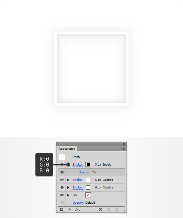 Make sure that your square is still selected, focus on the Appearance panel and add a third stroke. Select it, set the color at black (R=0 G=0 B=0) and the Weight at 3px then lower its Opacity to 3% and check the Align Stroke to Inside button.