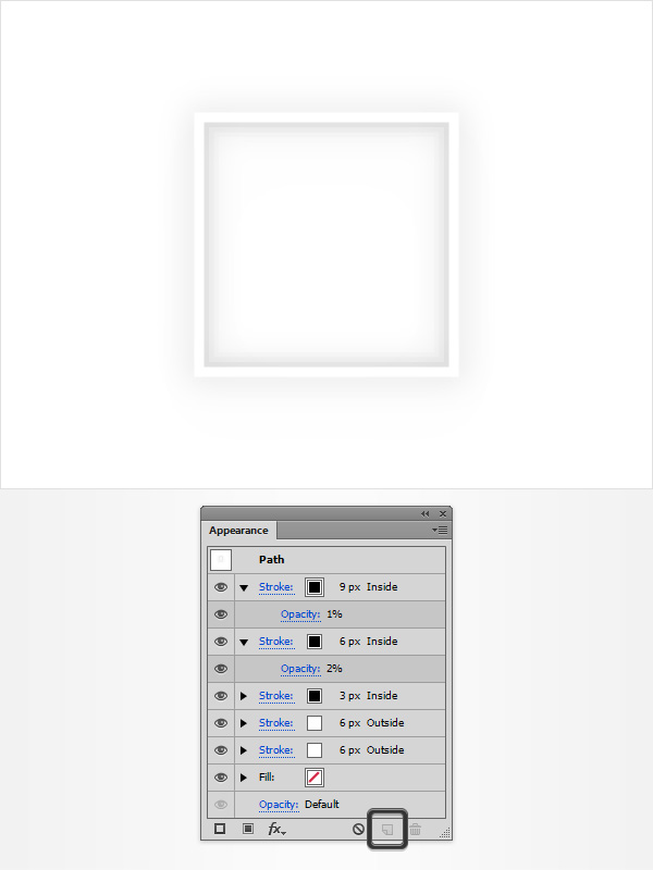 Make sure that your square is still selected, focus on the Appearance panel, select the black stroke and simply duplicate it using the Duplicate Selected Item button. Select the new stroke, increase the Weight to 6px and lower its Opacity to 2%. Make sure that the stroke added in this step is still selected and duplicate it using that same Duplicate Selected Item button. Select the new stroke, increase the Weight to 9px and lower its Opacity to 1%.