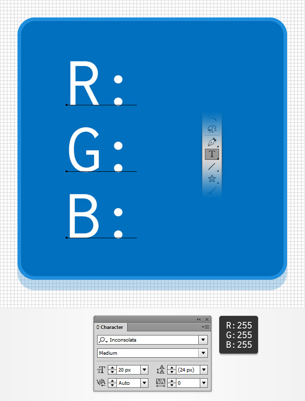 Focus on your 77 x 75px rectangle. Pick the Type Tool (T), simply click on your artboard and add the three piece of text shown in the following image. Set the color at white and use the Inconsolata font with the size 20px.