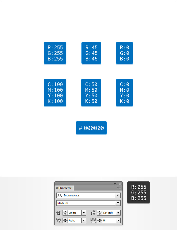 Make sure that the Type Tool (T) is still active and add a bunch of new text as shown in the following image. The Inconsolata font is a monospaced font, which means that your characters will occupy the same amount of horizontal space. This simply means that you won’t have to worry about the length of your text when you will need to change the colors codes.