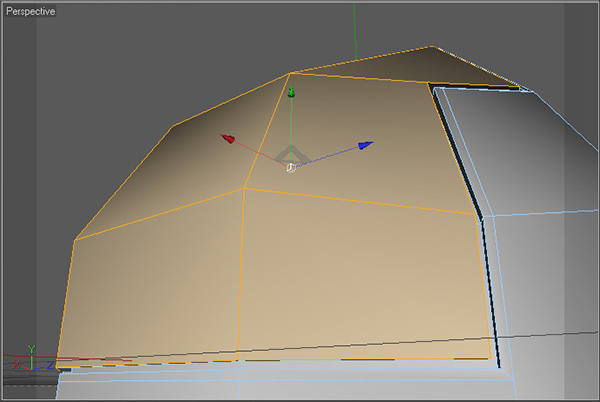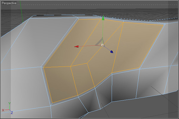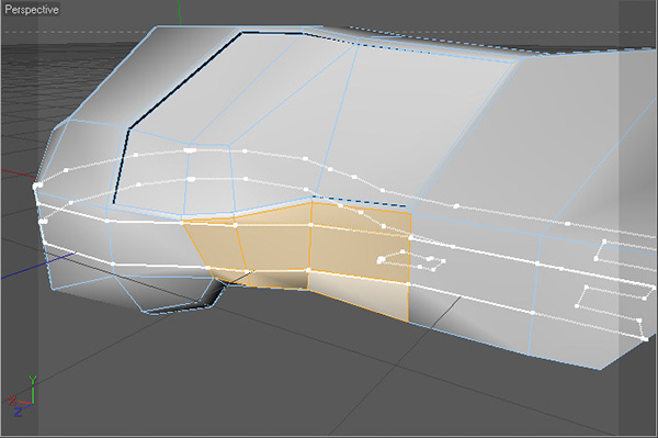 Select the 3 polygons that run horizontally across the center of our newly cut section and Extrude them twice as shown.