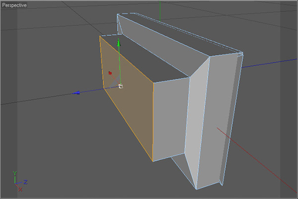 We’ll now add a small amount of detail to the other side of the object, so first select the back polygon, then use Extrude Inner followed by an Extrude to get the following shape.