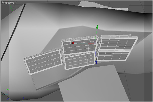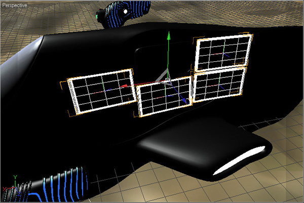 We’ll start off by creating the Display ship by utilising many of the same tools as we did for Day 1. So, first select the copy of the original ship made in Step 21 of Day 1 and make it visible. Select 6 polygons on the side of the ship as shown and use the Extrude Inner tool on them with an offset of approximately 3m. This will become the main display area.