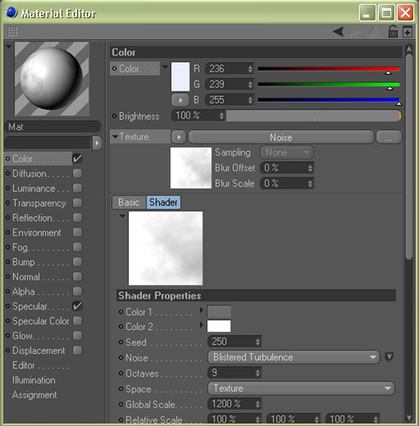 So, onto the materials! First, create a new material and in the Material Editor, change it’s Color to very light blue (in my case I used 236 239 255). For Texture, select Noise and then in the Shader Properties, select a grey for Color 1 and white for Color 2. Now change the Global Scale to something very high, around 1000-1500%, and change the Mix Mode (just off screen here) to Multiply.