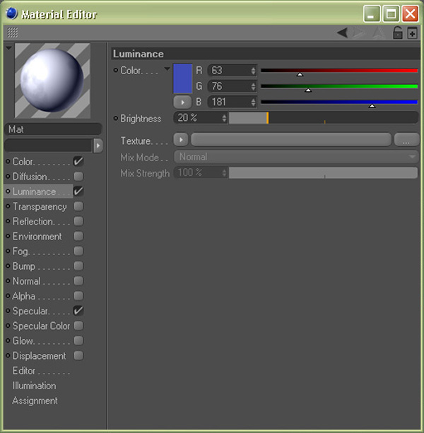 Turn on the Luminance checkbox and in the Luminance properties change Color to blue (in my case 63 76 181), and change the Brightness value to approximately 20%.
