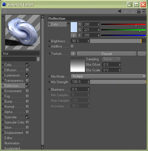 Now turn on Reflection, change it’s Color to a light blue (approximately 200 221 255), it’s Brightness to around 90% and it’s Mix Mode to Multiply. For Texture, add in a white to grey Fresnel.