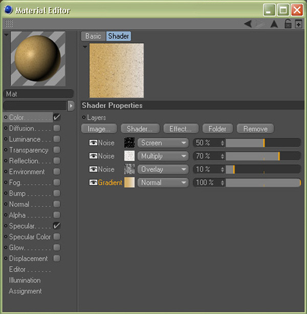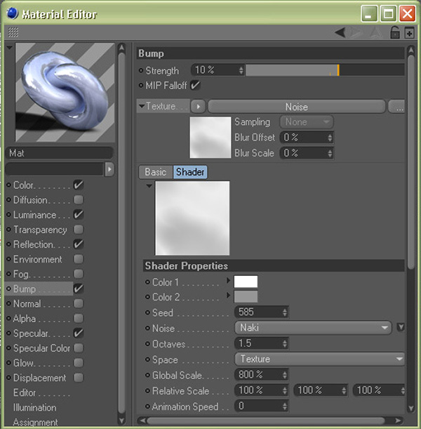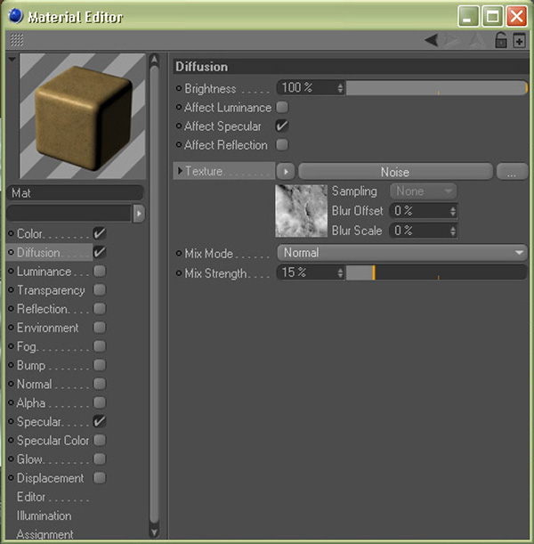 Click back again to return to our main material attributes, and in the Basic tab turn on Diffusion. In the Texture channel, add a Noise shader, and then alter it’s properties so that the Noise type is Luka, and the scale is somewhere between 600%-900%. Back in the Diffusion tab, set the Mix Strength to a low value, around 10%-20%.