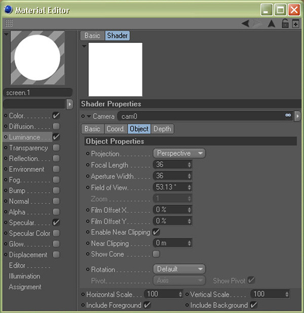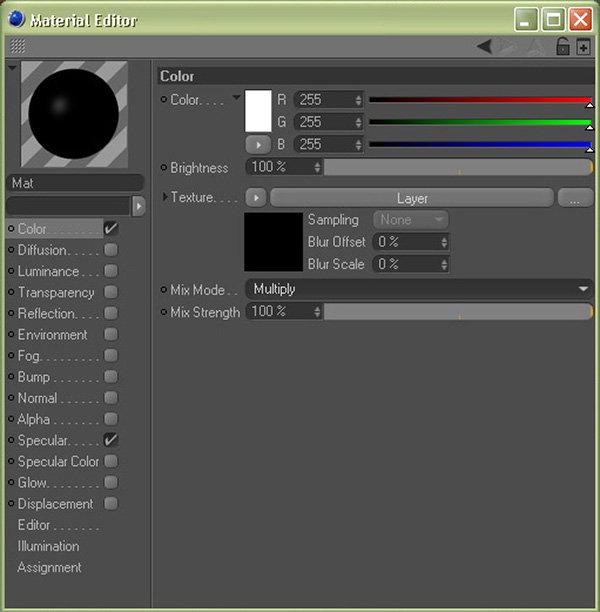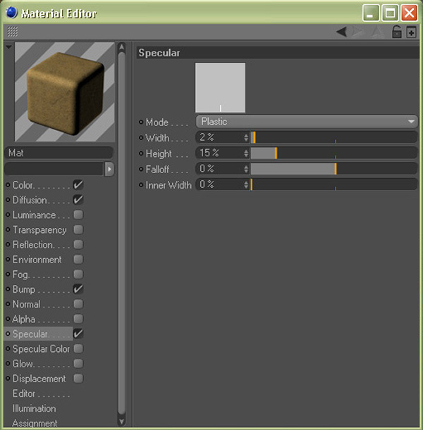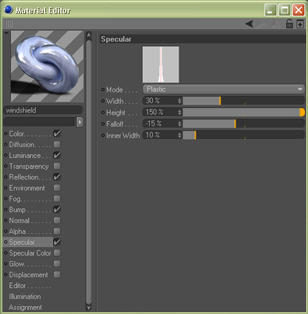 Now to finalise this material, add in Specular. Change the Width to approximately 30%, the Height to around 150%, the Falloff to -15%, and set the Inner Width to about 10%. Our windshield material is now ready.