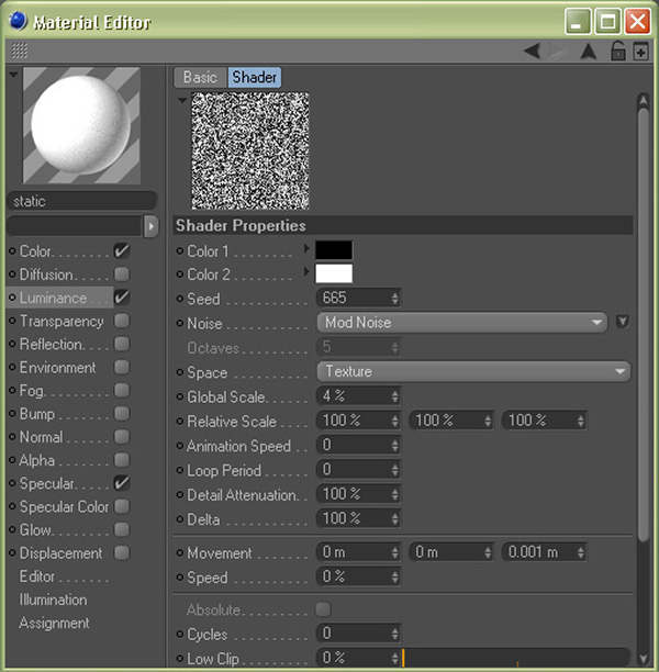 Create one last material for the ship. Turn on Luminance, and use Noise as the Texture, and change the Global Scale to something very low (in my case 4%). Our static display material is ready!