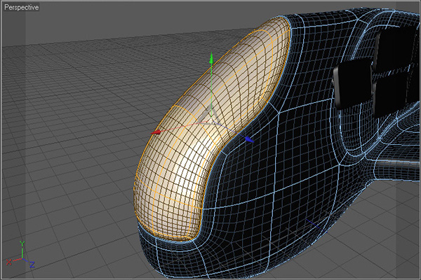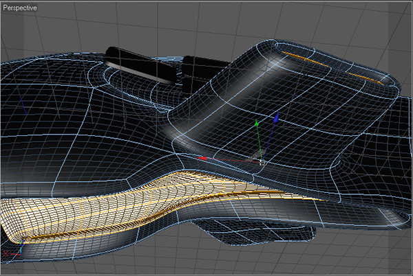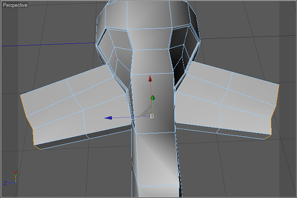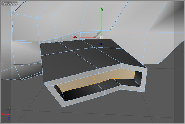 Now use Extrude Inner on our wing-tips, and then Extrude the polygons into the body of the wing as shown using a negative offset value. With this done, use Extrude Inner one more time on the selected polygons, however this time only use a very small distance – it should be barely noticeable! This is just to add a crease to the inside edge. Finally, add the selected polygons to a selection set called Nozzle using the Set Selection tool as before.