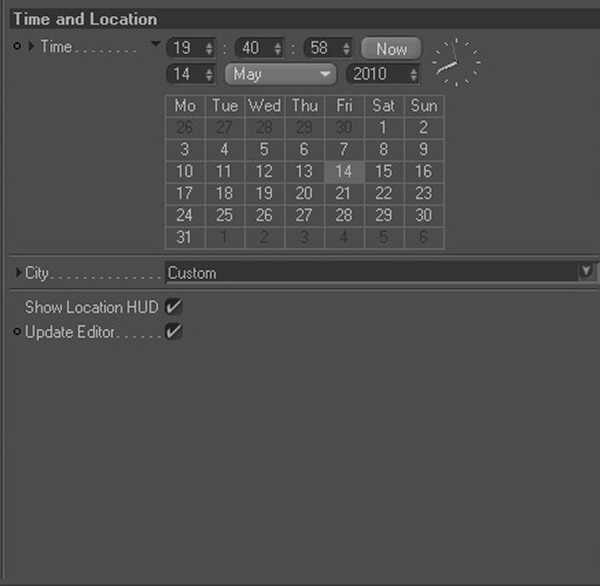 Create a Sky object by going to Objects > Sky > Create Sky. In the Time and Location tab of it’s attributes, change the time to a mid-evening, approximately 20:00. All of the other options are not important for now, however feel free to change them when experimenting with the final render!