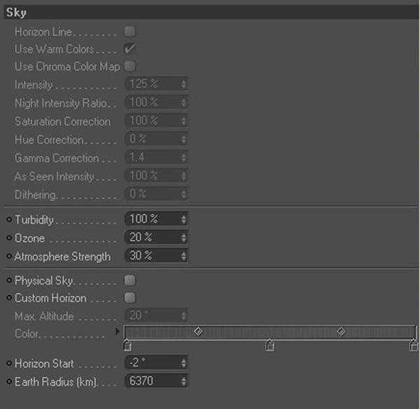 In the Sky tab, change Turbidity to 100%, Ozone to approximately 20%, and the Atmosphere Strength to around 30%. Then uncheck both Physical Sky and Custom Horizon.
