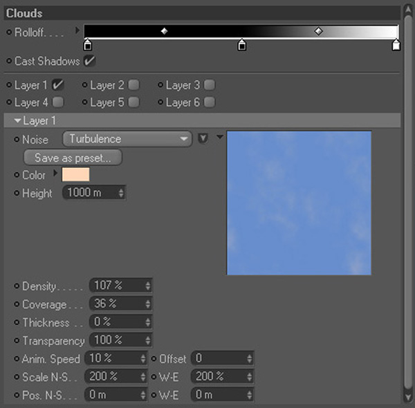 Back in the Basic tab, uncheck Sun and turn on Clouds. Head over to the Clouds tab, and add in a black to white gradient for the Rolloff as shown below. For now, leave only one layer checked and start experimenting with the options to get a look that you like! My settings are shown below :