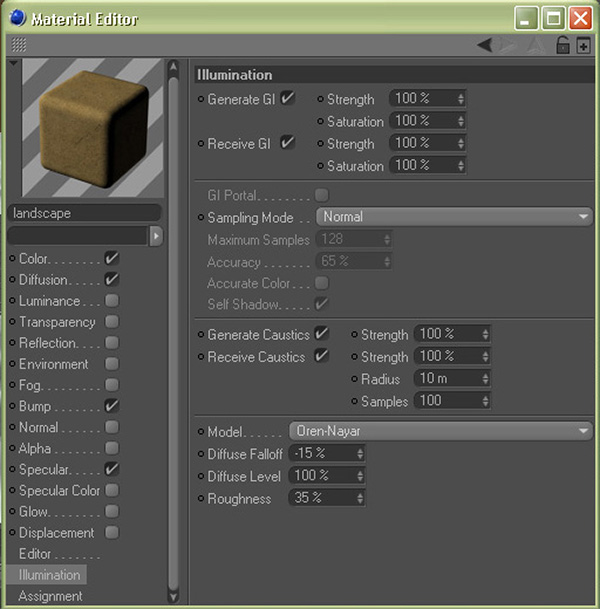 In the Illumination tab, change the Model to Oren-Nayar, the Diffuse Falloff to approximately -15%, and finally the Roughness to about 35%. Our landscape material is complete!