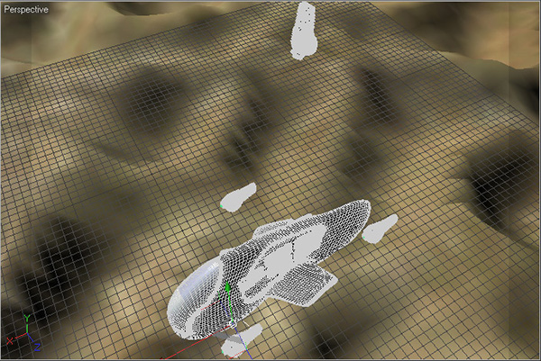 Finally Extrude the selected polygons back out so that they are on the same level (or just higher) than the main body of the ship. Use the Set Selection command as outlined in Day 1, Step 21.