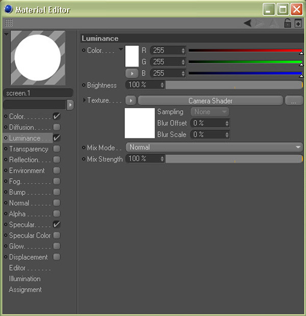 Create one final new material. Turn on Luminance and then in the Luminance attributes, add in a Camera Shader from the Mograph menu option as our Texture. Now duplicate this material for every screen you want to be turned on in the final render!