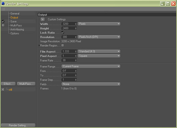 Now open the Render Settings by going to Render > Render Settings, or by hitting Ctrl+B. Tweak the Output and Save options as required. I typically save a Multi-Pass output in .PSD Photoshop format.