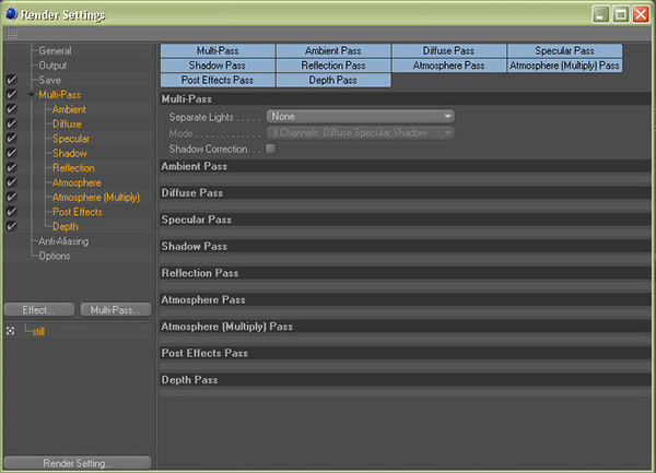 Now check the Multi-Pass option and using the Multi-Pass menu button, add in all of the used channels as seen below, along with the Object Buffer pass :