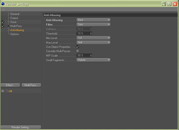 In the Anti-Aliasing section, change Anti-Aliasing to Best and the Filter to Sinc which should give us the sharpest results.