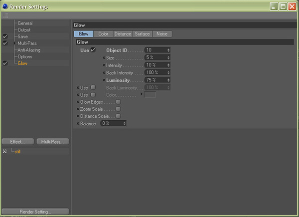 Select Glow using the Effect menu button to add the Glow effect to our scene. In the Glow settings, change the Object ID to match the Object Buffer number found in the camera’s Compositing tag. Here I’ve used 10, though by default this will be set to 1. Now slightly lower the Luminosity value, which will turn down the amount of glow in our scene.