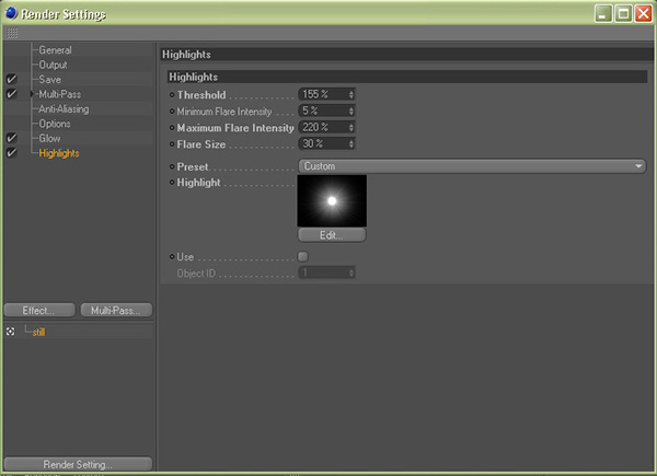 Just as with the glow, add a Highlights effect from the Effects menu button. In the settings, raise the Threshold value to around 150%, and then lower the Maximum Flare Intensity and the Flare Size values as shown. This is to prevent the final render appearing blown-out. Finally, choose a presets that you like or you could even create your own using the Edit button. We’re now ready to render!