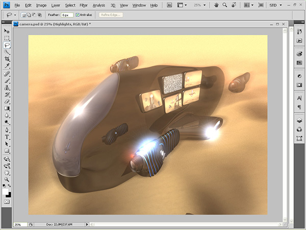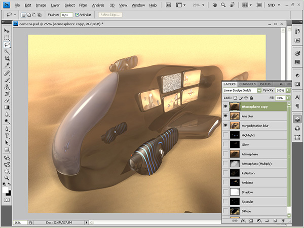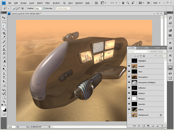 With our scene rendered it’s onto the final post-production! Open the rendered .psd file in Photoshop, and then merge all of the layers except the Highlights layer into a brand new layer by selecting them and hitting Ctrl+E (or CMD-E on a Mac).