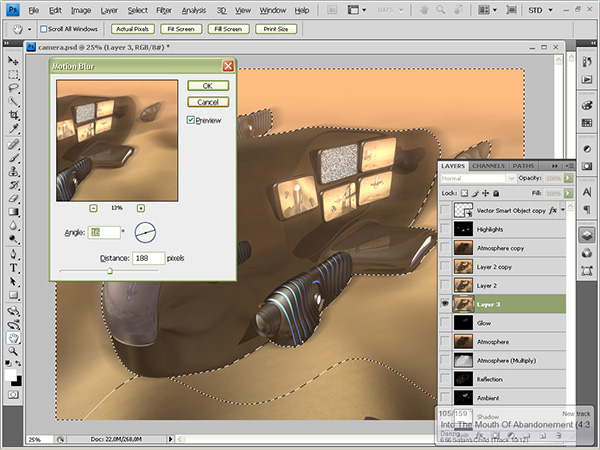 Now we need to add in some motion blue. First of all, switch over to the Channels tab and Ctrl+click on the Depth channel thumbnail. Then invert your selection by pressing Ctrl+Shift+i, which will select everything except the ships (we don’t want these to be blurred! With the merged layer selected, go to Filter > Blur > Motion Blur. In the Motion Blur dialog, choose an Angle that matches the ship’s direction and a large Distance value (I used something around 150-200 pixels). Click OK to apply.