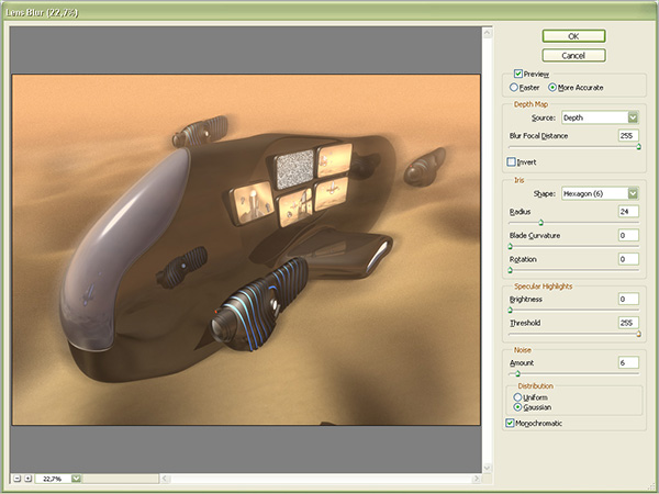 Now, deselect everything using the Ctrl-D shortcut, and then with the same layer selected, go to Filters > Blur > Lens Blur. In the Lens Blur settings, change the Source to Depth, change the Radius to approximately 25 and the noise Amount to around 5. Click OK to apply.