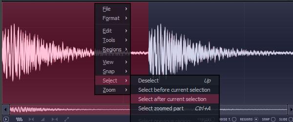 When it’s looking good, select all with Ctrl+A and copy and paste the audio with Ctrl+C and Ctrl+V. Now you’ll have two copies of the drum hit. Right-click anywhere on the waveform and choose ‘Select after current selection’ from the ‘Select’ menu, or just use the mouse to select the second copy of the drum.