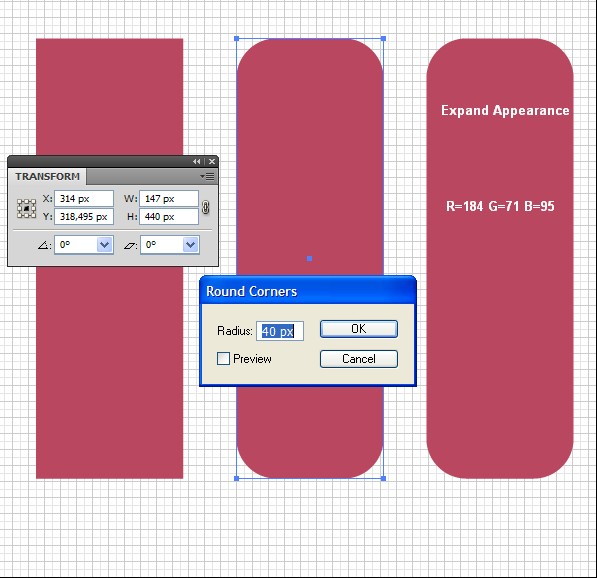 Open a new document, and create a 147px by 440px rectangle. Go to Effect > Stylize > Round Corners and set the Radius to: 40px, and click OK. This will round the rectangle’s corners, straight after that go to Object > Expand Appearance and fill the shape with the color R:184 G:71 B:95.