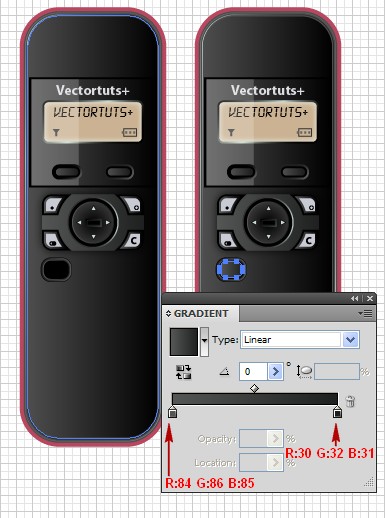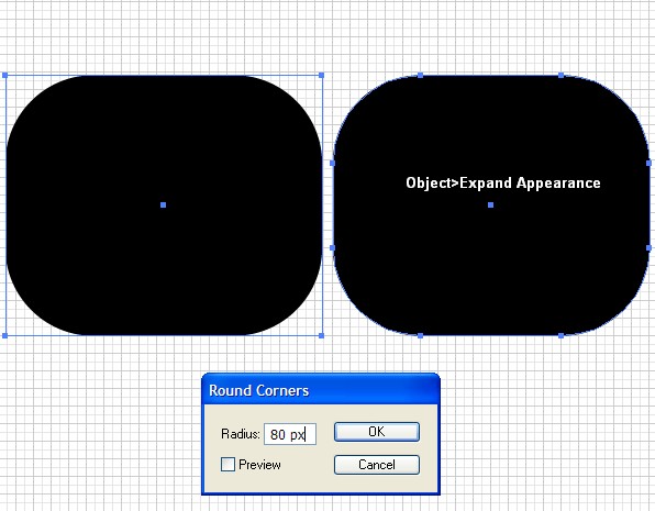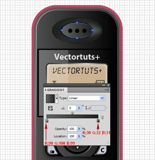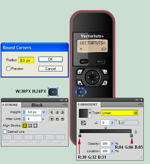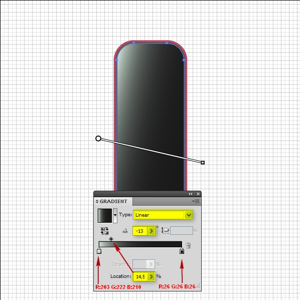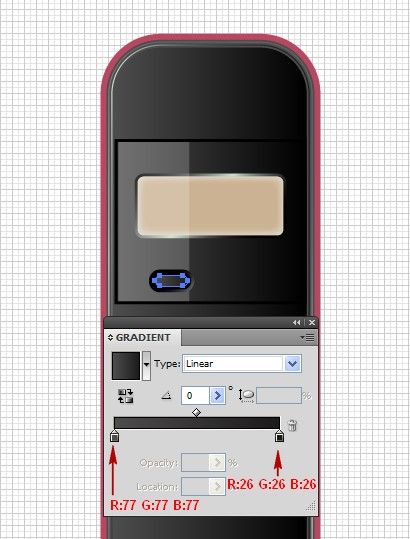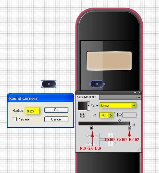 Create 30px by 15px rectangle, then go to Effect > Stylize > Round Corners and set the Radius to: 8px, click OK, then go to Object > Expand Appearance. Fill the shape with a Linear gradient from black to grey and position it as shown in the picture below.