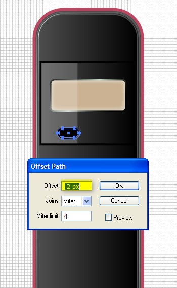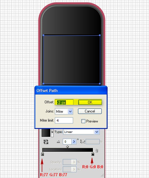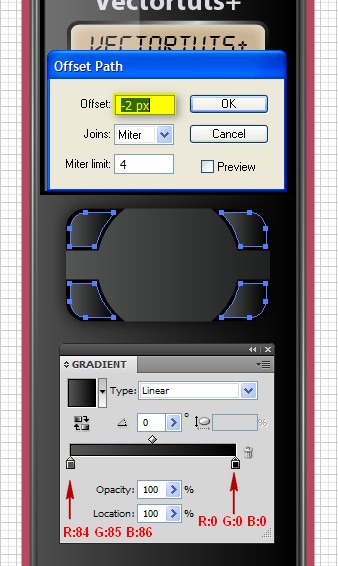 With the rectangle still selected, go to Object > Path > Offset Path and set the Offset to: -2px, click OK and fill it with a Linear Gradient with colors from grey to black. Take a look at the picture below for reference.