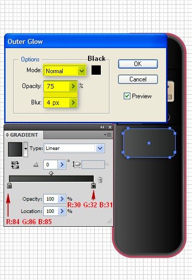 Create a rounded rectangle with the dimensions 102px by 56.5px, corners 10px, fill with Linear Gradient (colors R:84 G:86 B:85 to R:30 G:32 B:31), then go to Effect > Stylize > Outer Glow. Enter the following settings: Mode: Normal, Opacity: 75%, Blur: 4px, black color, click OK. Position the shape as shown in the picture below.
