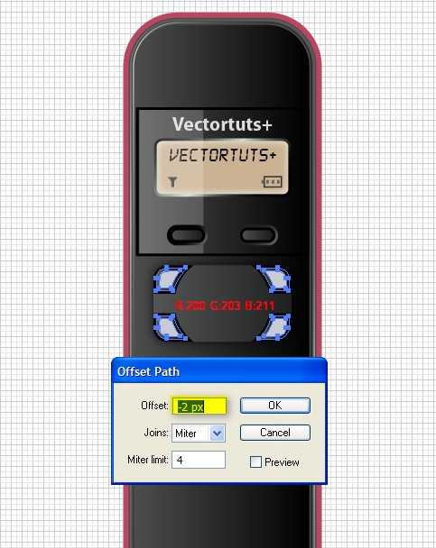 With the shape from the previous step still selected, go to Object > Path > Offset Path and set the Offset to: -2px, click OK, and change the colors for the gradient as shown in the picture below.