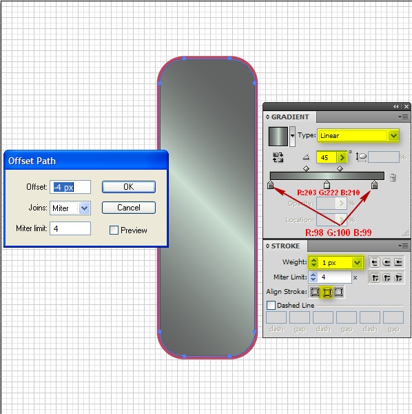 With the rectangle rounded rectangle still selected, go to Object > Path > Offset Path and set the Offset to: -4px, click OK and fill with Linear Gradient. To do this, open the Gradient panel: Window > Gradient (Control + F9). You need 3 gradient sliders, from left to right set the color R:98 G:100 B:99, for the second one R:203 G:222 B:210 and for the third slider select the same color you used for the first gradient slider, set the Angle to 45 and apply a Stroke Color of R:77 G:77 B:77, Weight: 1px inside.