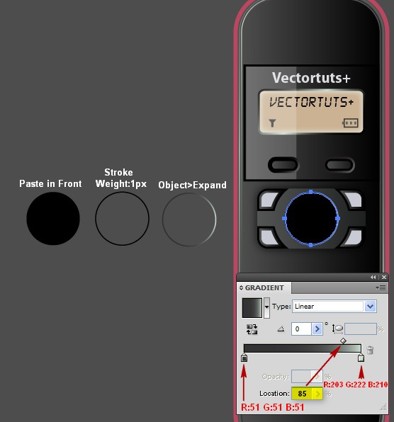 Create a black 50px by 50px circle with the Ellipse tool (L), copy the circle using Control + C followed by Control + F, turn off the Fill Color, apply a 1px Stroke, the color doesn’t matter because we’ll fill it with Linear Gradient. With the shape still selected, go to Object > Expand and fill with Linear Gradient with colors R:51 G:51 B:51 to R:203 G:222 B:210.