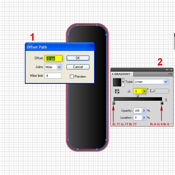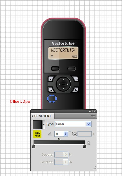 Keep the object selected and, once again, go to Object > Path > Offset Path and set the Offset to: -2px and fill the new shape with a Linear Gradient from grey to dark grey.