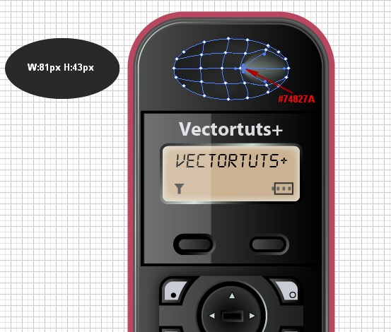 In a position above the display, create an ellipse with the dimensions 81px by 43px and color #282A29, then go to Object > Create Gradient Mesh, enter the following settings: Rows: 4, Columns: 5, click OK. Correct the points and the color as shown in the picture below.