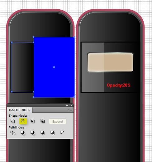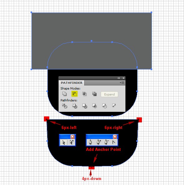 Lock the phone group or turn it off by clicking on the eye in front of the group. Create a 288px by 237px rectangle and go to Effect > Stylize > Round Corners and set the Radius to: 80px, click OK and go to Object > Expand Appearance. After that create another rectangle, this time wider than the previous one (shown in the picture below). Select both shapes, open the Pathfinder panel and click on the Minus Front button, correct the key points as shown in the example.