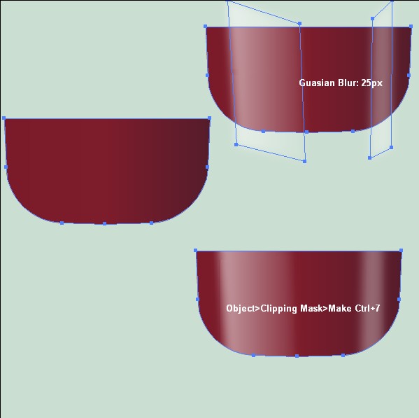 Fill the last shape you created with Linear Gradient. To do this, open the Gradient panel (Window > Gradient or Ctrl+F9). You need 3 Gradient sliders. From left to right apply the color R:123 G:27 B:42, R:125 G:28 B:43 and R:87 G:28 B:43. Create two shapes over the previous one using the Pen tool (P), fill them with a Linear Gradient from white 100% to white 0%, apply a 25px Gausian Blur. Select the shape from the previous step, copy it using Control + C followed by Control + F, move it over the shapes you just created. Select the newly created shapes and the shape you moved them over and go to Object > Clipping Mask > Make (Control + 7).