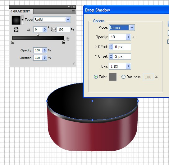 Copy the ellipse using Control + C followed by Control + F, move it a few pixels up, change the gradient to Radial with colors from grey to black, apply a Drop Shadow (Effect > Stylize > Drop Shadow) and enter the following settings: Mode: Normal, Opacity:50%, X Offset 0px Y Offset: 5px, Color: 6D6D6D.