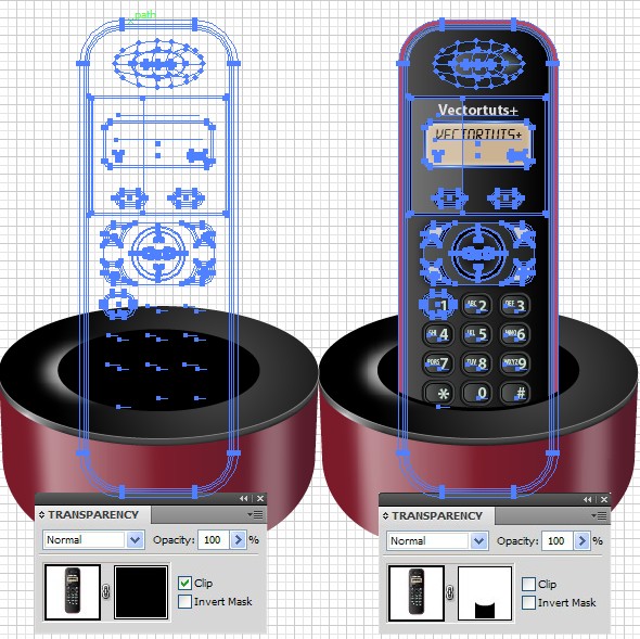 Select the phone group and the shape created in the previous step and open the Transparency panel. In the top right corner you’ll see an arrow, click on it, from the drop down menu select Make Opacity Mask. This will make the entire phone disappear, but we need to hide only the bottom part, so with the Transparency panel open, un-check Clip. This way only the bottom part of the phone will be hidden.