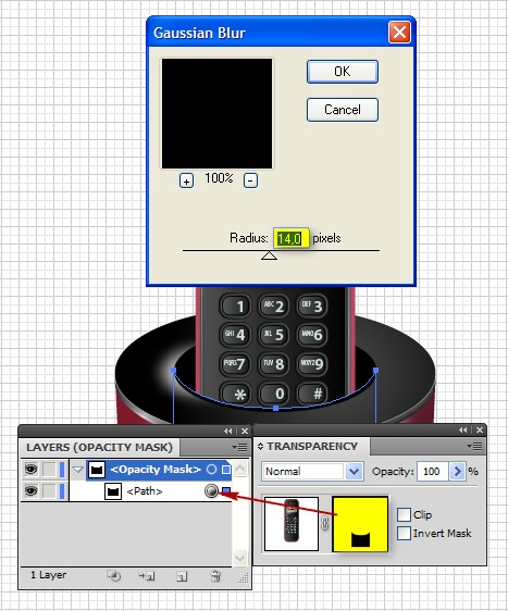 With the phone group still selected (and the Transparency panel still open), click once on the mask window. This way we can apply a Gasian Blur to the mask layer only. After you’ve selected the mask layer, go to Effect > Blur > Gausian Blur and set the Radius to: 14px, click OK. You’re now finished!