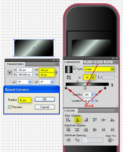 Create a 101px by 43px rectangle and go to Effect > Stylize > Round Corners and set the Radius to: 6px, click OK. Straight after that go to Object > Expand Appearance and fill it with Linear Gradient as shown in the picture below.
