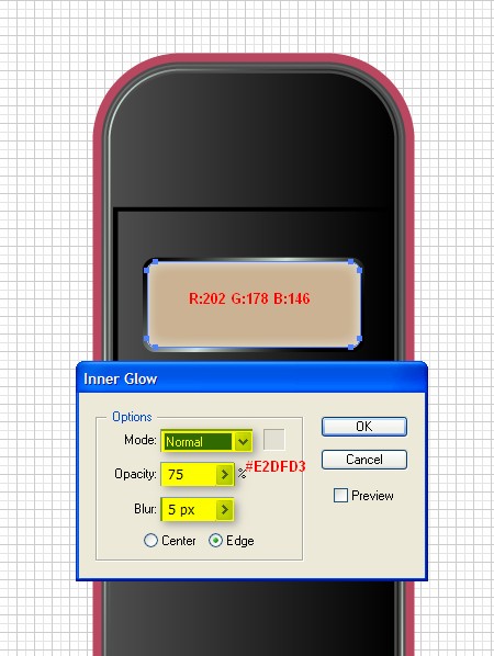 With the shape from the previous still selected, go to Object > Path > Offset path and set the Offset to: -2px, click OK, fill with the color R:202 G:178 B:146. Apply an Inner Glow by going to Effect > Stylize > Inner Glow. Enter the following settings: Mode: Normal, Opacity:75%, Blur:5px, Color #E2DFD3 (click the color square next to Mode".