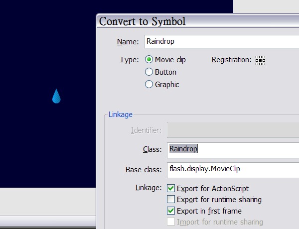 Create a new Flash document, choose a dark color for background, draw a raindrop on the stage, and convert the raindrop to a movie clip symbol, exported for ActionScript with a class name “Raindrop”. Delete the raindrop instance on the stage afterward.