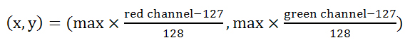 A color channel’s value ranges from 0 to 255, 127 being the average. A value less than 127 is regarded as negative by the bitmap field, while a value larger than 127 is taken positive. Zero is the most negative number and 255 is the most positive one. For example, if we have a pixel with a color 0xFF0000 in hexadecimal representation, meaning a red channel with value 255 and green channel with 0, then the bitmap field’s output for this pixel would be a vector with X component of a most positive possible number and Y component of a most negative possible number, where this most positive/negative possible number, or maximum number, is specific to the bitmap field. To be more precise, here’s the formula of the pixel-to-vector conversion.